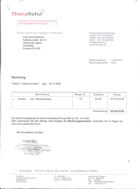![]() ![]() ![]() ![]() ![]() Cчет на лечение Счет за Томатис - терапию ![]() Счет за проживание.